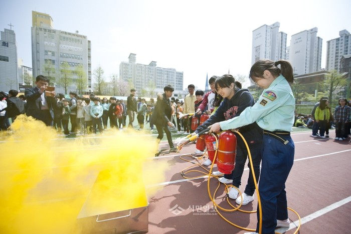 서울 중랑구는 지난 15일 중랑소방서와 함께 중화초등학교 학생 및 교직원을 대상으로 민방위의 날 훈련을 실시했다. 사진은 이날 교육에 참여한 학생들이 소화기로 불을 끄는 체험훈련을 하고 있는 모습. (사진제공=중랑구청)