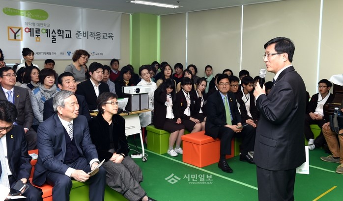 서울 노원구는 지난 15일 중계동 덕릉로 699 우암에이스타워 4층에서 예룸예술학교 중학교 입학식을 개최했다. 사진은 이날 김성환 노원구청장(오른쪽)이 입학생들에게 축하인사를 하고 있는 모습. (사진제공=노원구청)