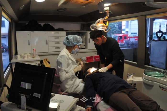 서울 동작소방서는 지난 15일 동작소방서 차고에서 서울시 장애인 치과병원이 운영하는 장애인 이동치과진료를 시행했다. 사진은 이날 장애인 이동치과에서 진료를 받고 있는 환자의 모습. (사진제공=동작소방서)