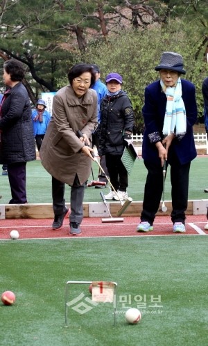 신연희 서울 강남구청장(왼쪽)이 지난 15일 오전 10시 강남구 늘벗공원에서 열린 ‘강남구청장배 생활체육 게이트볼 대회’에서 시타를 한 후 게이트를 통과하지 못해 아쉬워하고 있다. (사진제공=강남구청)