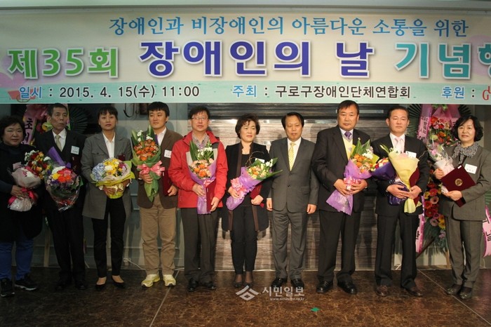 지난 15일 서울 구로구 정현탑 웨딩홀에서 '구로구 장애인의 날' 기념행사가 열렸다. 이날 행사는 내빈 축사, 장애인 유공자 표창 및 축하 공연 등으로 꾸며졌다. 사진은 이성 구로구청장(가운데에서 오른쪽)이 유공자들과 기념촬영한 모습. (사진제공=구로구청)