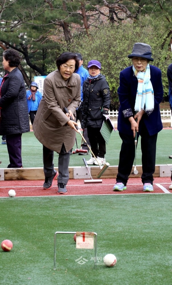 신연희 서울 강남구청장(왼쪽)이 15일 오전 10시 강남구 늘벗공원에서 열린 ‘강남구청장배 생활체육 게이트볼 대회’에서 시타를 한 후 게이트를 통과하지 못해 아쉬워하고 있다. (사진제공=강남구청)