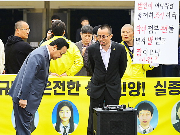 16일 오전 세월호 참사 1주기를 맞아 경기 안산 세월호 희생자 합동분향소를 찾았던 이완구 국무총리가 유가족에게 조문을 거절당하고 발길을 돌리고 있다. 이날 유가족은 이 총리에게 시행령 폐기 등에 대한 확답을 요구했지만, 이 총리가 확답하지 않자 조문을 거절했다.