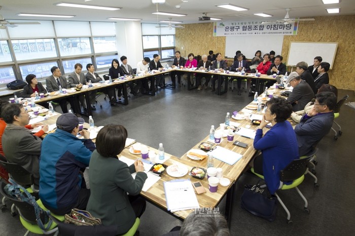 은평구는 최근 협동조합간 네트워크 구축으로 협동경제도시 만들기를 위한 '은평구 협동조합 아침마당'을 개최했다. 사진은 김우영 구청장, 박범용 서울시협동조합상담지원센터장 등 구 관계자들이 회의하는 모습.(사진제공=은평구청)