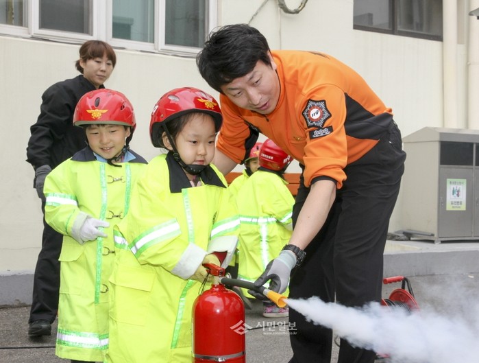 서울 동대문소방서는 지난 16일 소방서 후정에서 휘경어린이집 원생과 교사를 대상으로 소방안전교육을 실시했다. 사진은 교육에서 어린이들이 소방대원의 도움을 받아 소화기 사용 체험 중인 모습. (사진제공=동대문소방서)