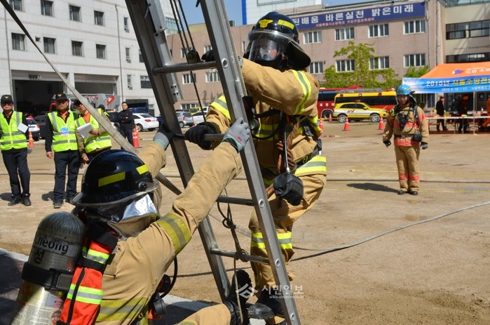 서울 강남소방서는 지난 17일 구조구급센터에서 서울소방 전술 경연대회 4인조법 부문에 참가했다. 사진은 이날 대회에 참여한 소방대원이 사다리를 타고 오르고 있는 모습. (사진제공=강남소방서)