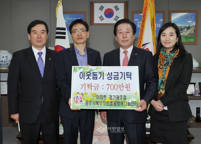 광주시북부무한돌봄행복나눔센터와 이마트경기광주점이 지난 16일 광주시청에 취약계층의 맞춤형 복지서비스를 위한 성금 700만원을 기탁했다. 사진은 이날 조억동 시장(오른쪽에서 두 번째)과 관계자들이 기념촬영한 모습. (사진제공=광주시청)