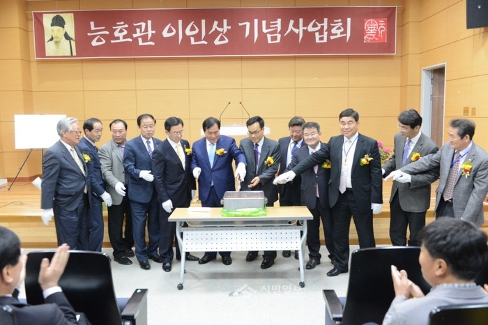 경기 양주시가 지난 16일 회암사지 박물관에서 능호관 이인상 선생을 기념하는 '능호관 이인상 기념사업회 발대식'을 개최했다. 사진은 이날 참여자들이 떡을 자르며 기념촬영한 모습. (사진제공=양주시청)