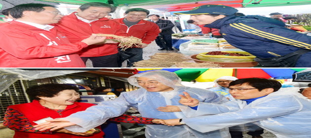19일 오후 4.29 재보궐선거가 치러지는 경기도 성남시 중원구 모란시장을 찾은 김무성 새누리당 대표와 신상진 후보가 시민들을 만나 지지를 호소하고 있다(왼쪽). 이날 새정치민주연합 정환석 후보와 문재인 대표도 유권자들에게 지지 호소를 했다.
