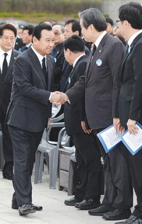 이완구 국무총리가 19일 오전 서울 강북구 국립4.19민주묘지에서 열린 제55주년 4.19혁명 기념식에서 새누리당 김무성 대표와 악수를 나누고 있다.
