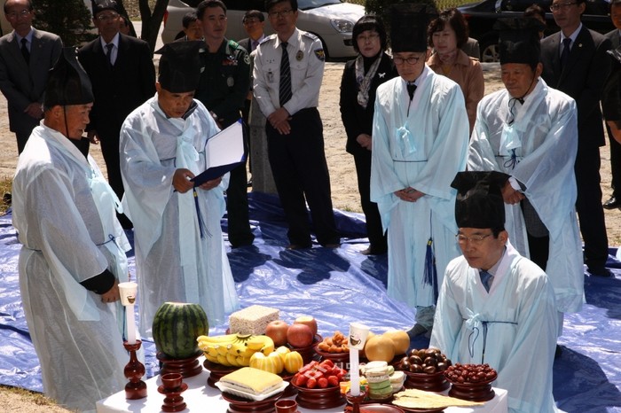 충북 보은군 내복면 이원리에서 21일 내북면 애향동지회의 주관으로 석성국 의사 추모제가 열렸다. 사진은 이날 참여자들이 추모제를 지내고 있는 모습. (사진제공=보은군청)