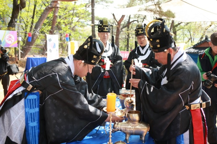 지난 21일 서울 강북구 우이동에서 삼각산 도당제 전승보존회가 마을의 안녕과 질서, 농사의 풍년과 가축의 번식 등을 신에게 기원하는 우리나라 전통 마을굿 '삼각산 도당제'를 지내고 있다. (사진제공=강북구청)