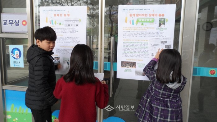 경기 부천시 성곡초등학교가 최근 장애학생에 대한 이해를 돕고 편견을 없애기 위해 '장애인식 개선교육'을 진행했다. 사진은 이날 학생들이 장애인식 개선내용이 담긴 포스터를 살펴보고 있는 모습. (사진제공=부천교육지원청)