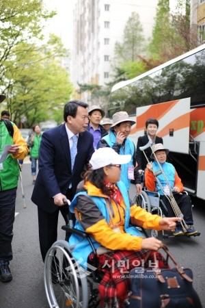 22일 오전 중랑구 신내종합사회복지관에서 열린 '제17회 장애인 넓은 세상보기 국토순례 발대식' 행사에서 나진구 중랑구청장(왼쪽)이 장애인들의 휠체어를 밀어주고 있다. (사진제공=중랑구청)