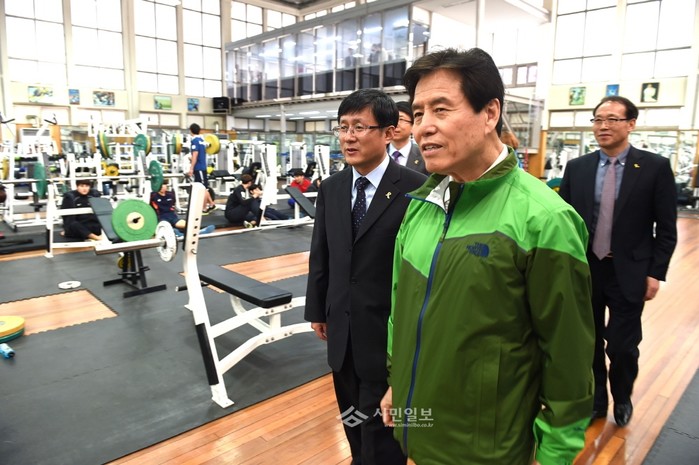 김성환 노원구청장(왼쪽)이 지난 22일 오전 11시20분 태릉선수촌장실에서 최종삼 태릉선수촌장(오른쪽)과 문화·체육·관광분야 상호교류 협력을 위한 업무협약(MOU)을 체결한 후 태릉선수촌 훈련시설을 둘러보고 있다. (사진제공=노원구청)
