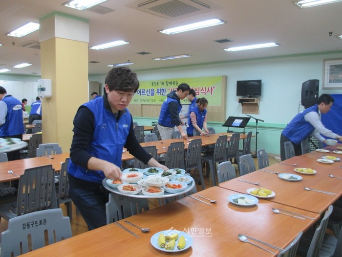 서울 강동구가 최근 강동구민회관에서 소외 노인들을 위한 '강동한마음봉사의 날'을 개최했다. 사진은 이날 배식 봉사를 위해 참여한 삼성 SDS 직원들이 반찬을 나르고 있는 모습. (사진제공=강동구청)