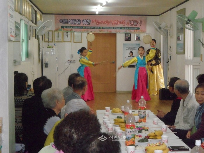 서울 은평구 증산동 주민자치위원회가 지난 22일 증산동 할머니 경로당에서 노인들을 위한 '찾아가는 행복마을 만들기' 행사를 개최했다. 사진은 이날 한국무용 공연을 펼치고 있는 어린이들의 모습.(사진제공=은평구청)