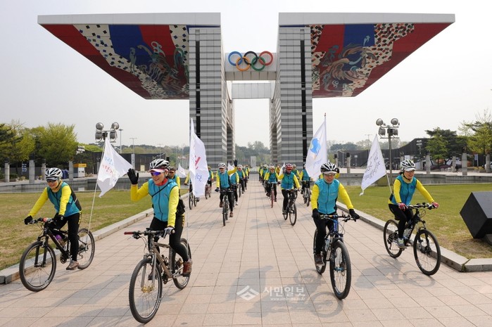지난 22일 '자전거의 날'을 맞아 서울 송파구 올림픽공원 평화의 문 앞~성내천~위례성대로를 달리는 코스로 실시된 행사에 참가한 자전거 동호회원과 주민 100여명이 올림픽공원 평화의 문에서 출발하고 있다. (사진제공=송파구청)