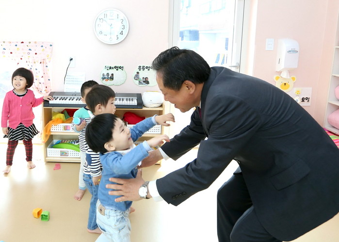 서울 금천구가 지난 22일 오전 10시 구립 새싹 어린이집의 개원식을 개최했다. 사진은 이날 차성수 금천구청장(오른쪽)이 개원식을 찾아 어린이집 원아를 안아 주고 있는 모습. (사진제공=금천구청)
