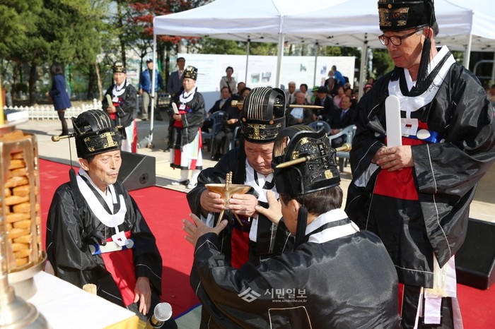 최근 서울 동망봉 숭인근린공원에서 실시된 ‘단종비 정순왕후 추모문화제에 참석한 종로구의회 의원들이 전통 궁중제례 의식에 따른 추모제례에서 술을 올리고 있다.