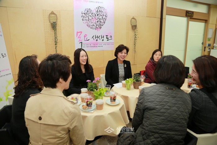 경기 과천시가 최근 직장맘과 시장이 함께하는 '목요 생생토크'를 진행했다. 사진은 이날 행사에 참여한 여성들이 신계용 시장(가운데)과 이야기를 나누고 있는 모습.