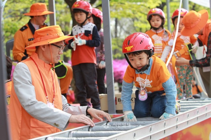 서울 구로소방서가 최근 여의도공원 문화의 광장에서 '피난사다리 이용 탈출체험' 코너를 운영했다. 사진은 이날 행사에 참여한 어린이들이 피난사다리 탈출 체험을 하고 있는 모습. (사진제공=구로소방서)