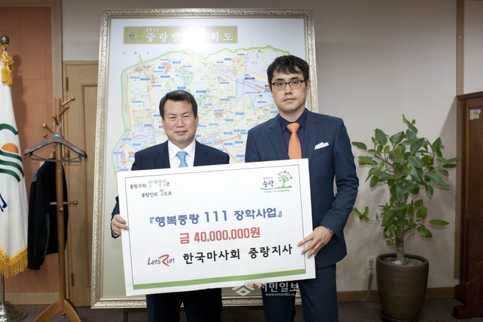 서울 중랑구 한국마사회 지사가 지난 24일 오후 '행복중랑 111 장학사업'에 4000만원의 장학기금을 기탁한 후 나진구 중랑구청장(왼쪽)과 기념 촬영을 하고 있다. (사진제공=중랑구청)