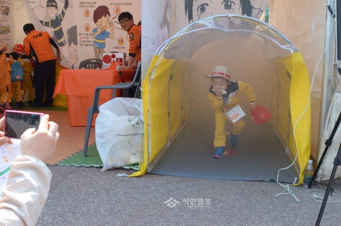 서울 영등포소방서가 지난 24일 '서울안전체험한마당' 행사장에서 화재발생시 연기속에서 안전하게 대피하는 요령을 배우는 '터널 탈출 체험장'을 운영했다. 사진은 이날 참여한 어린이들이 입을 가리고 연기가 자욱한 터널을 탈출하고 있는 모습. (사진제공=영등포소방서)