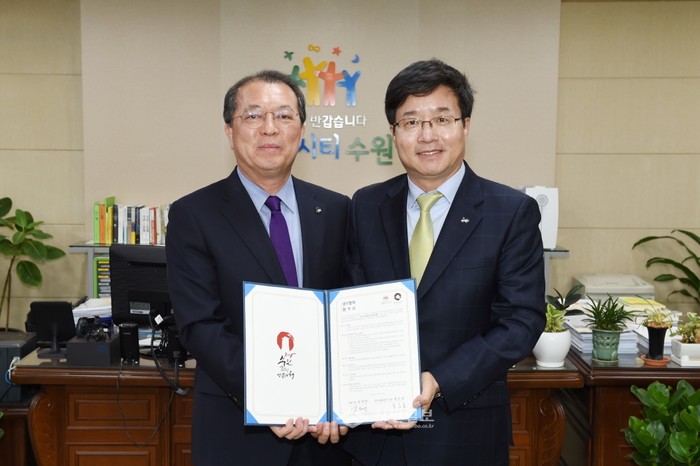 경기 수원시가 '2016 수원화성 방문의 해' 사업의 성공적 추진을 위해 경기관광공사와 27일 업무협약을 체결했다. 사진은 이날 협약식에서 염태영 수원시장(오른쪽)과 홍승표 경기관광공사 사장이 기념촬영한 모습. (사진제공=수원시청)