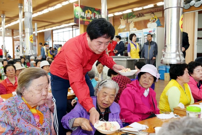 대한적십자사 용인청명봉사회가 지난 25일 기흥구에 거주하는 노인 250여명을 지역내 식당에 초청해 '희망풍차 경로잔치'를 열였다. 사진은 이날 행사에 참여한 정찬민 용인시장(오른쪽)이 음식을 나르고 있는 모습. (사진제공=용인시청)