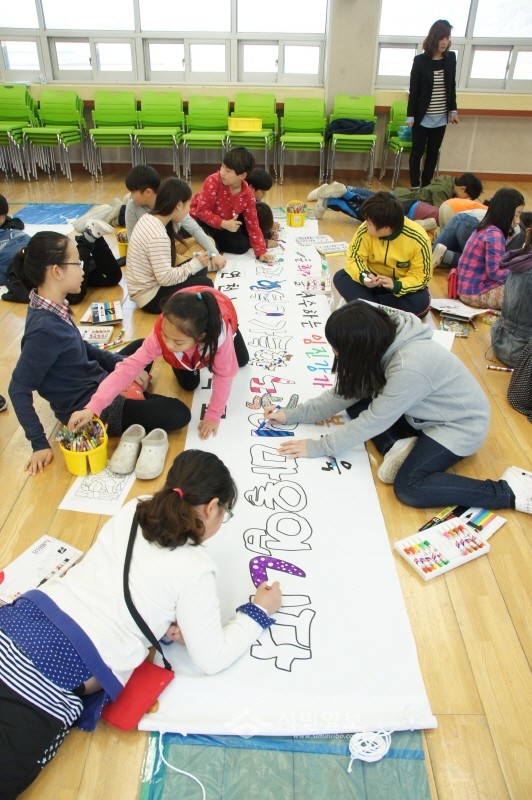 경기 연천노곡초등학교 학생들이 최근 마을을 소개하는 현수막을 직접 제작했다. 사진은 참여 학생들이 '여기는 사랑과 행복이 가득한 노곡리 마을입니다'라는 문구가 담긴 현수막을 제작 중인 모습. (사진제공=연천군청)