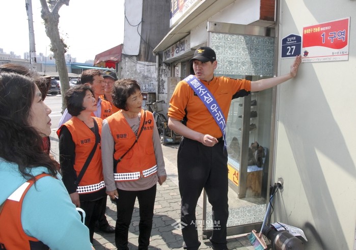 동대문소방서가 지난 27일 오후 청량리지역 일대에서 '2015년 상반기 화재없는 안전마을 캠페인'을 실시했다. 사진은 이날 참여자들이 화재경계지구 현판이 붙은 상점 앞에서 소방대원의 설명을 듣고 있는 모습. (사진제공=동대문소방서)