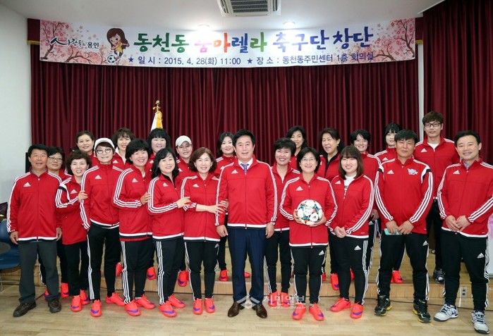 경기 용인시 동천동주민센터에서 28일 줌마렐라 축구단 창단식이 진행됐다. 사진은 이날 참석한 정찬민 시장(앞줄 가운데)이 축구단원들과 기념촬영한 모습. (사진제공=용인시청)