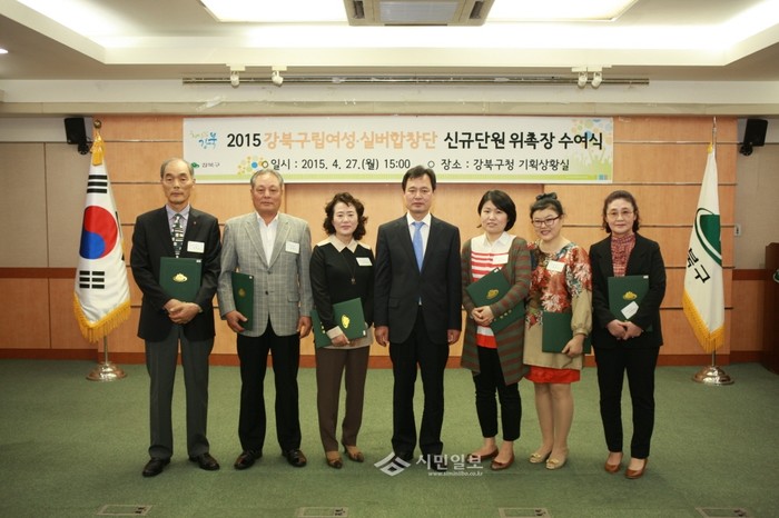 서울 강북구 박겸수 구청장(왼쪽에서 네 번째)이 지난 27일 구청 기획상황실에서 구립문화예술단체인 여성합창단과 실버합창단 단원 7명을 새로이 위촉해 신규단원 위촉장을 수여하고 기념사진을 촬영하고 있다.(사진제공=강북구청)