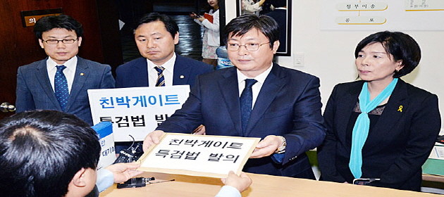 새정치민주연합 진성준, 김관영, 이춘석, 최민희 의원(왼쪽부터)이 친박게이트 특검법률안을 28일 오후 서울 여의도 국회 본관 의안과에 제출하고 있다.