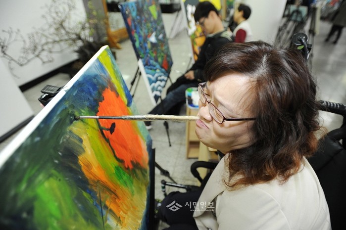 | ▲ '제35회 장애인의 날'을 맞아 지난 15일 오전 서울 송파구 구민회관에서 개최한 '2015 송파 장애인의 날' 행사에서 화가 이현정씨(뇌병변 1급)가 입에 붓을 물고 그림을 그리고 있다.(사진제공=송파구청) | ||