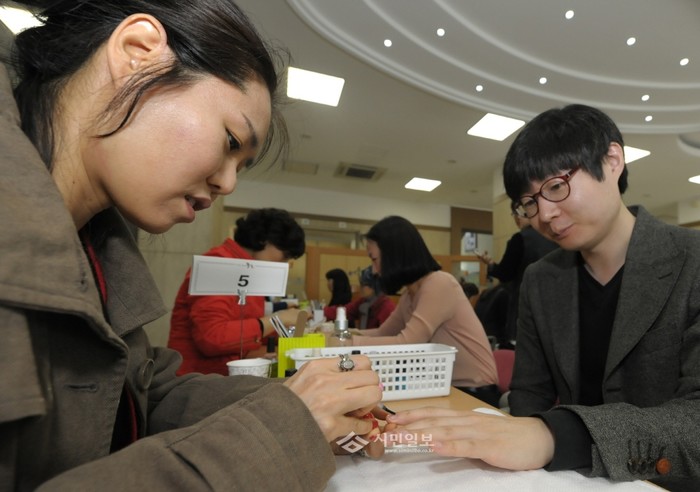중구는 전문인력 양성과정을 수료한 예비취업자들이 주민과 구청 직원을 대상으로 무료로 제공하는 네일케어 및 네일아트 서비스를 29일 오전 10시부터 구청 1층 로비에서 진행했다. 사진은 네일아트 교육생들이 직원들에게 무료 서비스를 제공하고 있는 모습. (사진제공=중구청)