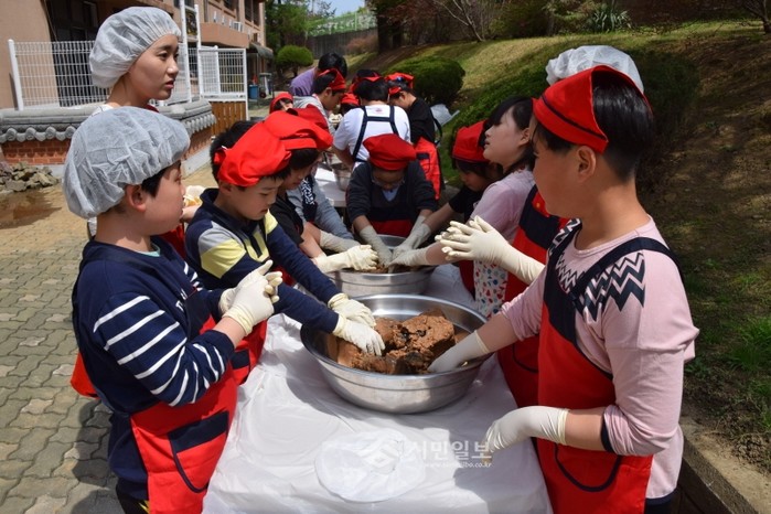 경기 연천군 백학초등학교가 지난 28일 전통 음식과 농산물의 중요성을 학생들에게 전하고자 전통 장독대 '장 가르기' 행사를 진행했다. 장 가르기는 장독대에서 된장과 간장을 분리하는 작업이다. 사진은 이날 참여 학생들이 장 가르기 체험을 하고 있는 모습. (사진제공=연천교육지원청)