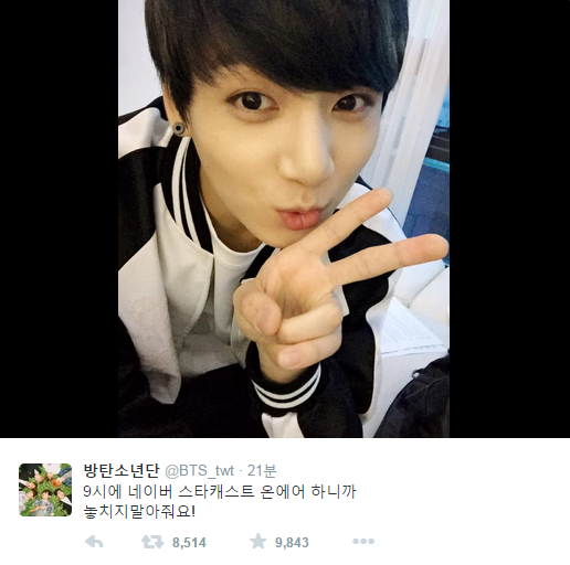 방탄소년단 공식트위터에는 본방사수 독려글과 사진도 올라와 눈길을 끈다.