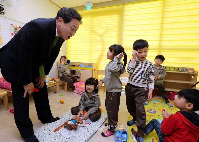 서울 금천구가 30일 오전 10시 구립 금하새빛어린이집 개원식을 개최했다. 사진은 이날 행사에 참여한 차성수 금천구청장(왼쪽)이 어린이들과 함께 이야기하고 있는 모습. (사진제공=금천구청)