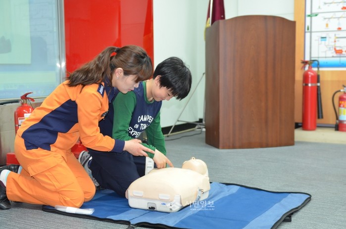 서울 강남소방서는 지난달 30일 본서에서 신구중학교 학생 9명을 대상으로 직업체험교육을 실시했다. 사진은 이날 교육에 참석한 어린이들이 심폐소생술 체험을 하고 있는 모습. (사진제공=강남소방서)