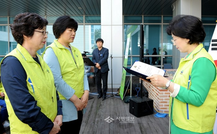 최근 서울 송파구 장지동 송파자원순환공원에서 열린 '쓰레기 감량 실천단 발족 및 결의대회'에 참가한 박춘희 구청장이 참석자들에게 위촉장을 수여하고 있다. (사진제공=송파구청)