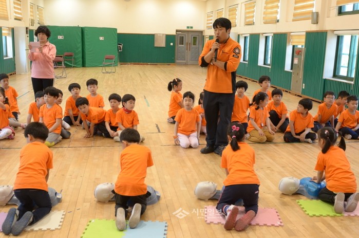 서울 영등포소방서가 지난달 30일 영중초등학교 1학년 학생들을 대상으로 안전교육을 강화하기 위한 소방안전교육을 실시했다. 사진은 이날 참여 어린이들이 소방대원의 교육에 따라 심폐소생술을 배우고 있는 모습. (사진제공=영등포소방서)