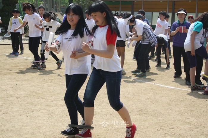 경기 부천시 옥산초등학교가 지난 1일 어린이날을 기념해 '옥산 한마음 놀이마당'을 개최했다. 사진은 이날 놀이마당에 참여한 학생들이 2인3각 이어달리기를 하고 있는 모습.