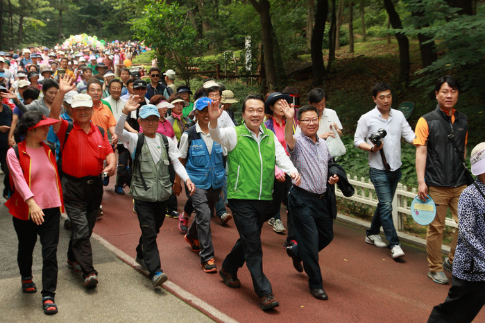 | ▲ 우장산 근린공원에서 펼쳐진 걷기대회에 참석한 노현송 구청장(앞줄 가운데)이 주민들과 함께 걷고 있는 모습. | ||
