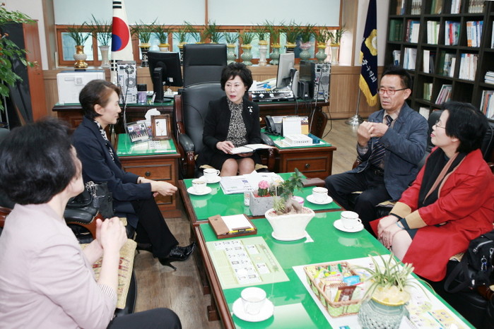 최근 이경일 중구의회 의장(가운데)이 의장실에서 지역 장애인단체 지회장들과 함께 장애인단체 사무실 임대비 부족 등 장애인단체의 운영에 관한 고충과 문제점 등에 대해 의논하고 있다.(사진제공=중구의회)