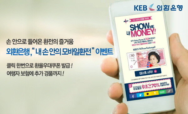 외환은행은 오는 8월31일까지 환전고객을 위한 '내 손 안의 모바일환전' 이벤트를 실시한다. 특히, 이번 이벤트에서는 다양한 국가의 지폐 속 주인공이 되어보는 게이미피케이션(Gamification) 형태의 '쇼미내머니' 디지털 캠페인도 시현된다. 이를 SNS 또는 모바일 메신저로 공유하는 고객들에게는 모바일환전 전용 '주요통화 무조건 70% 환율우대쿠폰'이 발급(이를 이용해 환전시 여행자보험 자동가입)되며, 추가 추첨을 통해 스타벅스 기프티콘도 증정한다.