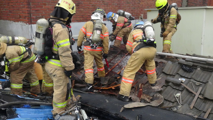 | ▲ 서대문소방서 소방관들이 화재현장 지붕 위에서 화재를 진압중이다. /사진제공=서대문소방서 | ||