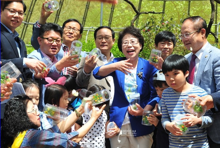 인천 부평구가 지난 5일 '부평숲 인천나비공연'에서 '어린이날 행사'를 개최한 가운데 홍미영 구청장(가운데)과 관계자들이 어린이들과 함께 나비를 날리고 있다.(사진제공=부평구청)