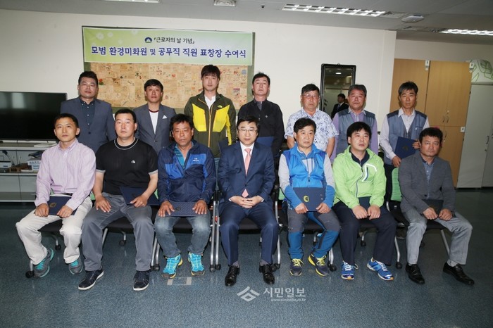 서울 도봉구가 최근 근로자의 날을 맞아 지역내 최일선 청소현장에서 성실하게 근무하는 모범환경미화원 및 공무직 직원에게 표창장을 수여했다. 사진은 이날 수여식에 참석한 이동진 도봉구청장이 모범환경미화원 등과 함께 기념촬영 중인 모습. (사진제공=도봉구청)
